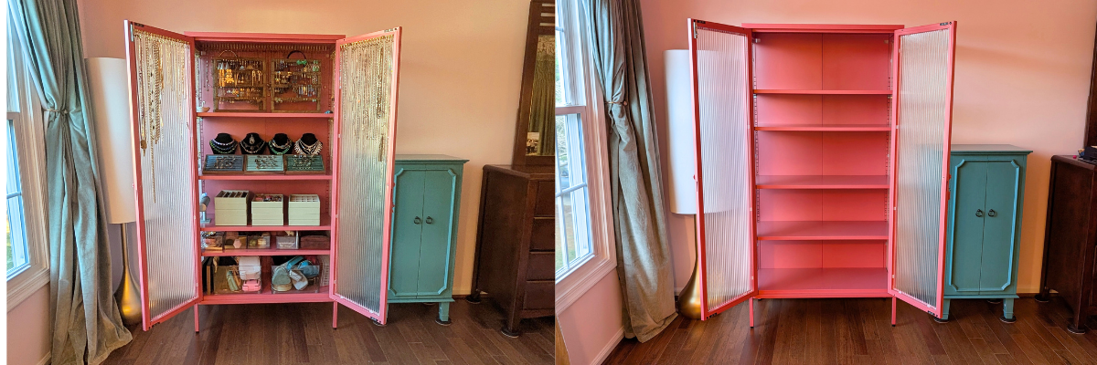 L’armoire était parfaite pour devenir ma grande boîte à bijoux verrouillable, mais elle avait besoin d’être personnalisée. Voici ce que j’ai fait :